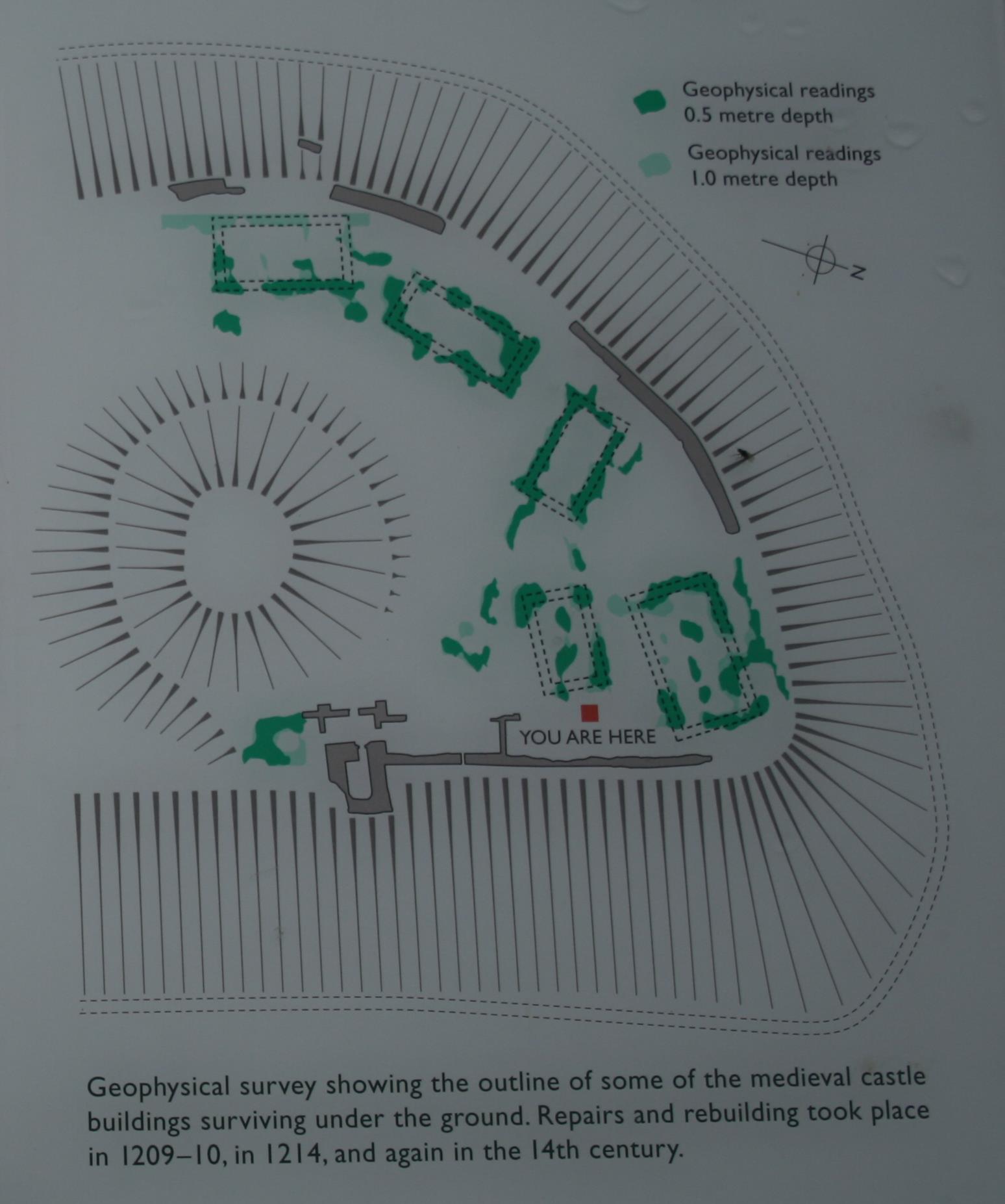 South of the motte evidence of temporary wooden structures was found along with a hearth, iron and bronze waste, nails and slag indicating a smithing area and workshop during the 14th century. South of the workshop were two lime kilns, again 14th century but probably after the workshop ceased to function. The lack of structure indicates temporary use and probably erected for repair work to the Castle. However, around the north end of the motte, geophysics has shown foundations of several buildings (pic below). Busy place once upon a time.