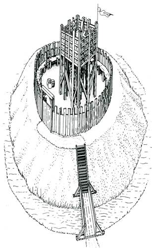 Bayeux Tapestry – defending the wooden dwelling on top of the motte surrounded by a ditch