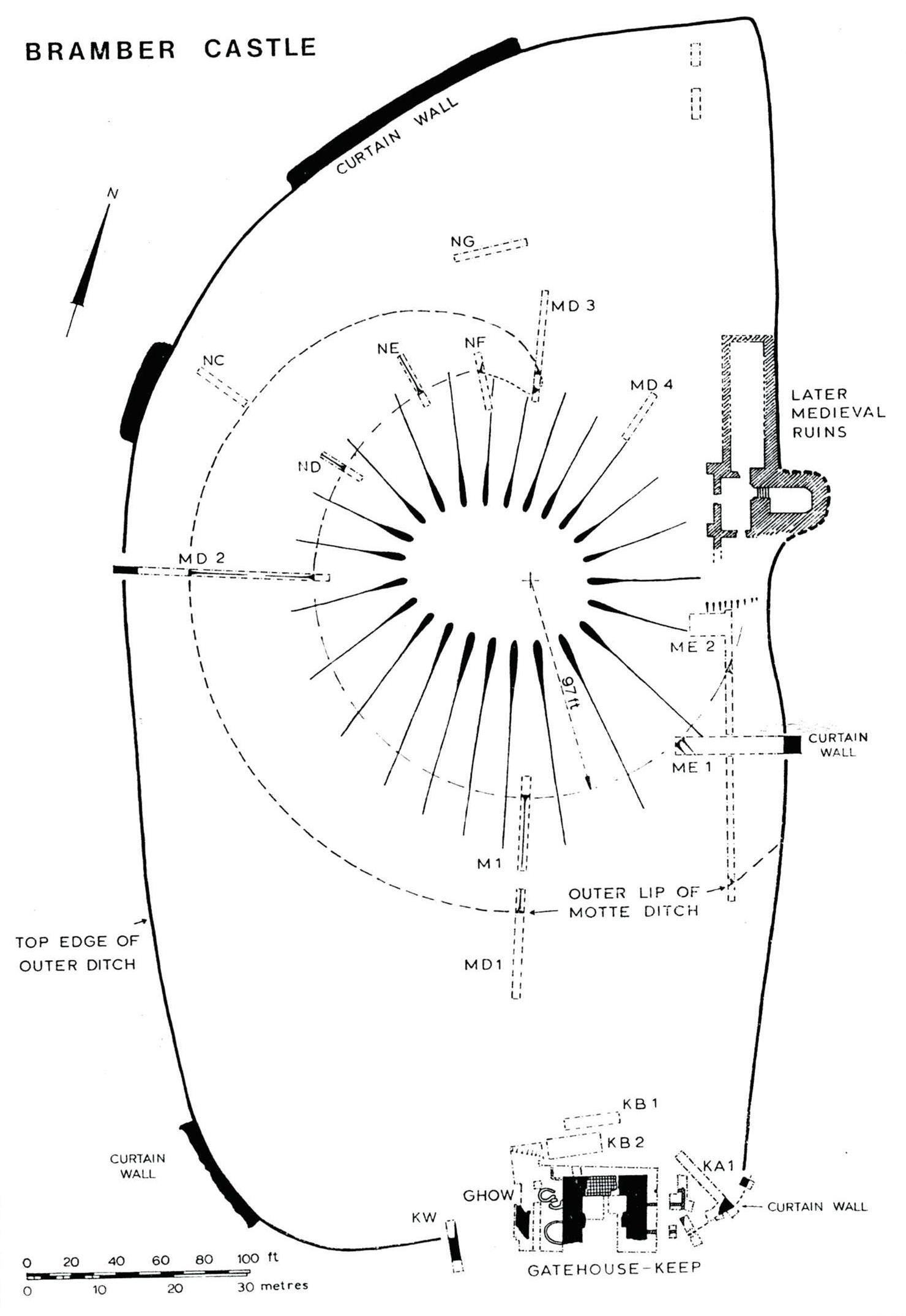 Plan of Castle grounds (Barton & Holden, ‘Excavations at Bramber Castle’ Sussex 1966-7′, Archaeological Journal, 1977: 14)