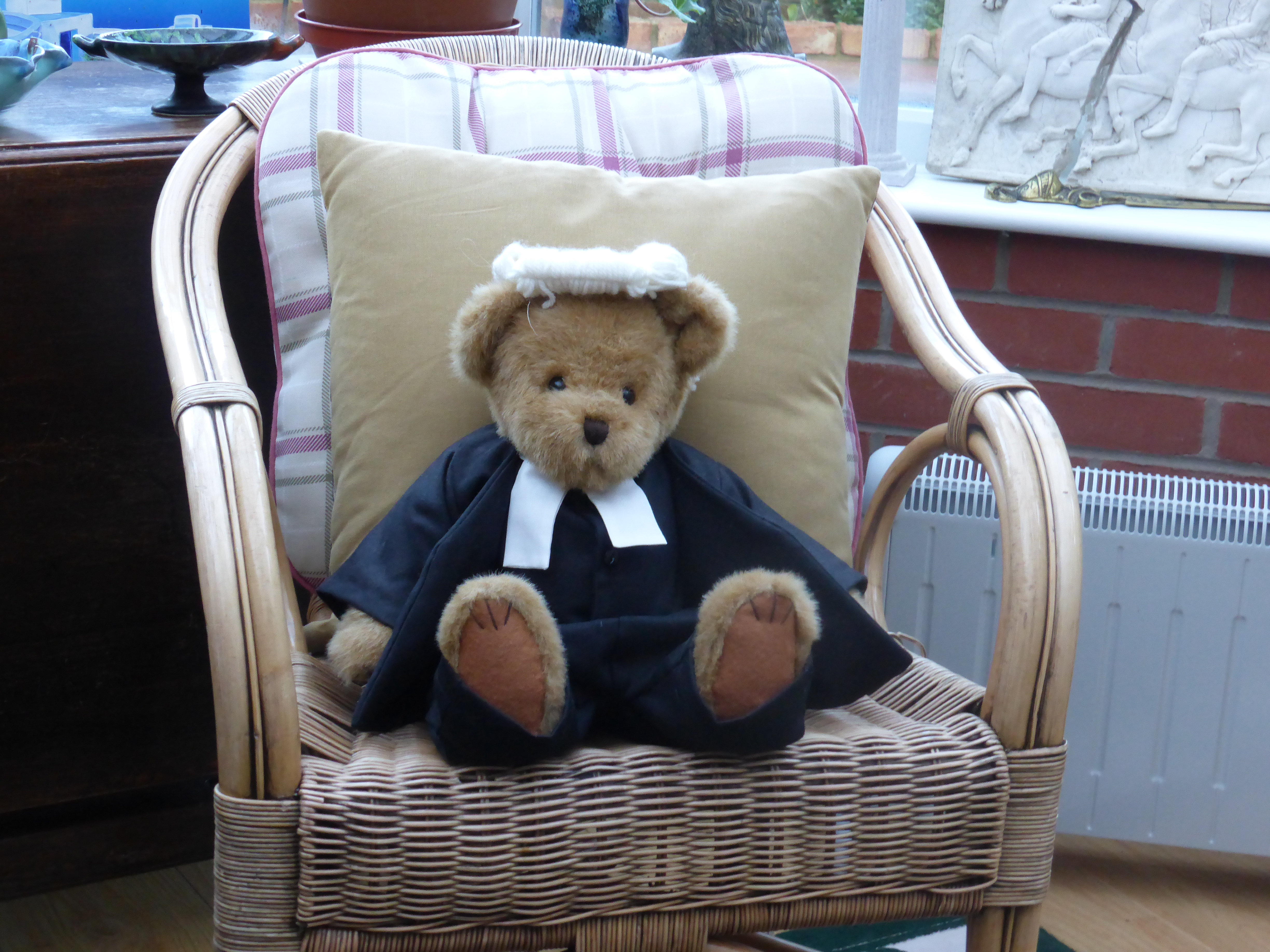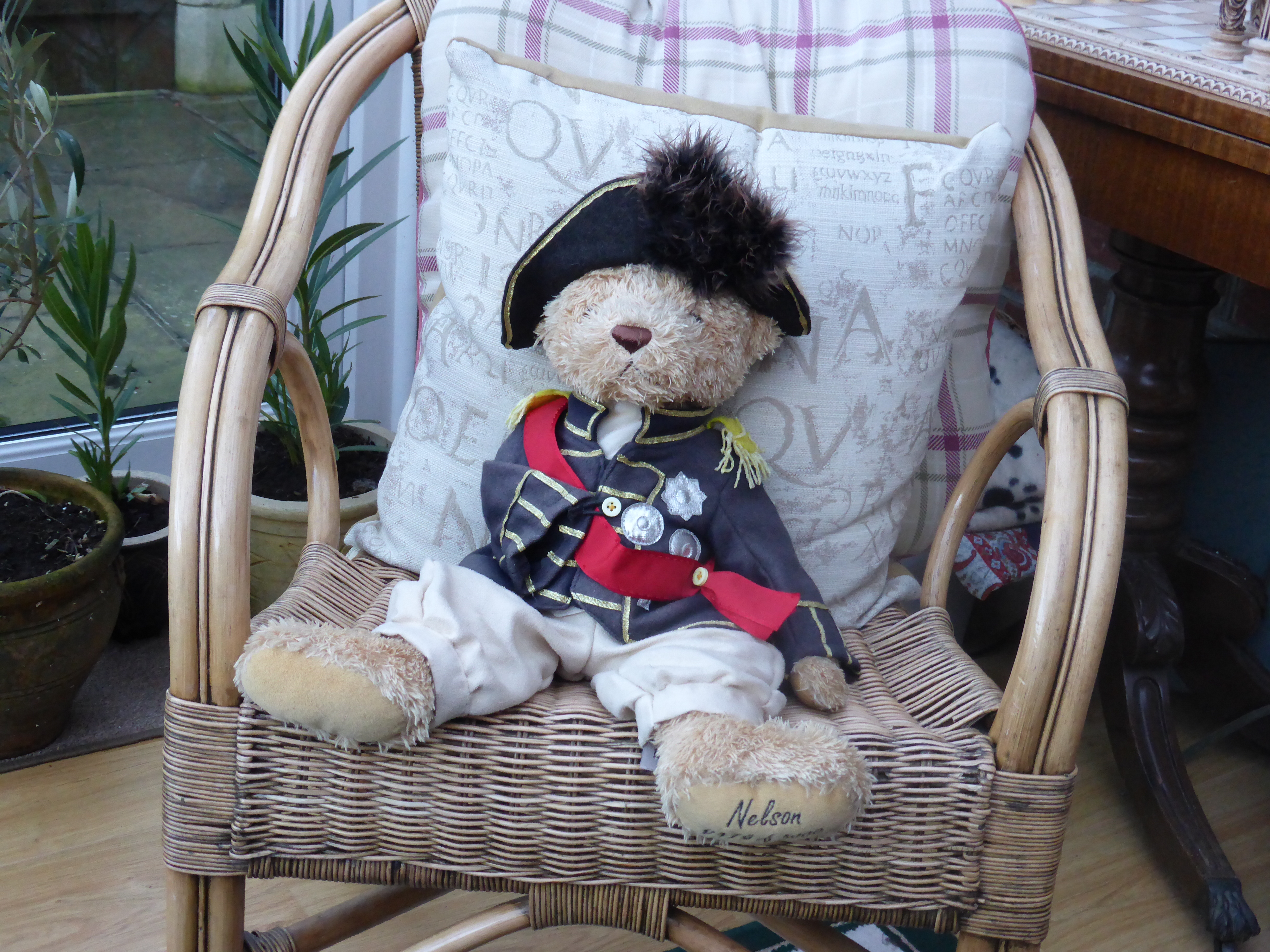 We have two teddy bears in the conservatory, Horatio and Mortimer, and they guard the chairs from possession by our cat. Then there are three more teddy bears in the house – my bear who, believe it or not, is called Teddy and is as old as I am; and Sarah’s two teddy bears, one as old as her and one brought back from Hong Kong by her father returning from his Royal Naval duties in the mid-1960s. These three teddy bears live together in the lounge/study but I decided that they could come and join Horatio, Mortimer and myself in the conservatory that evening.