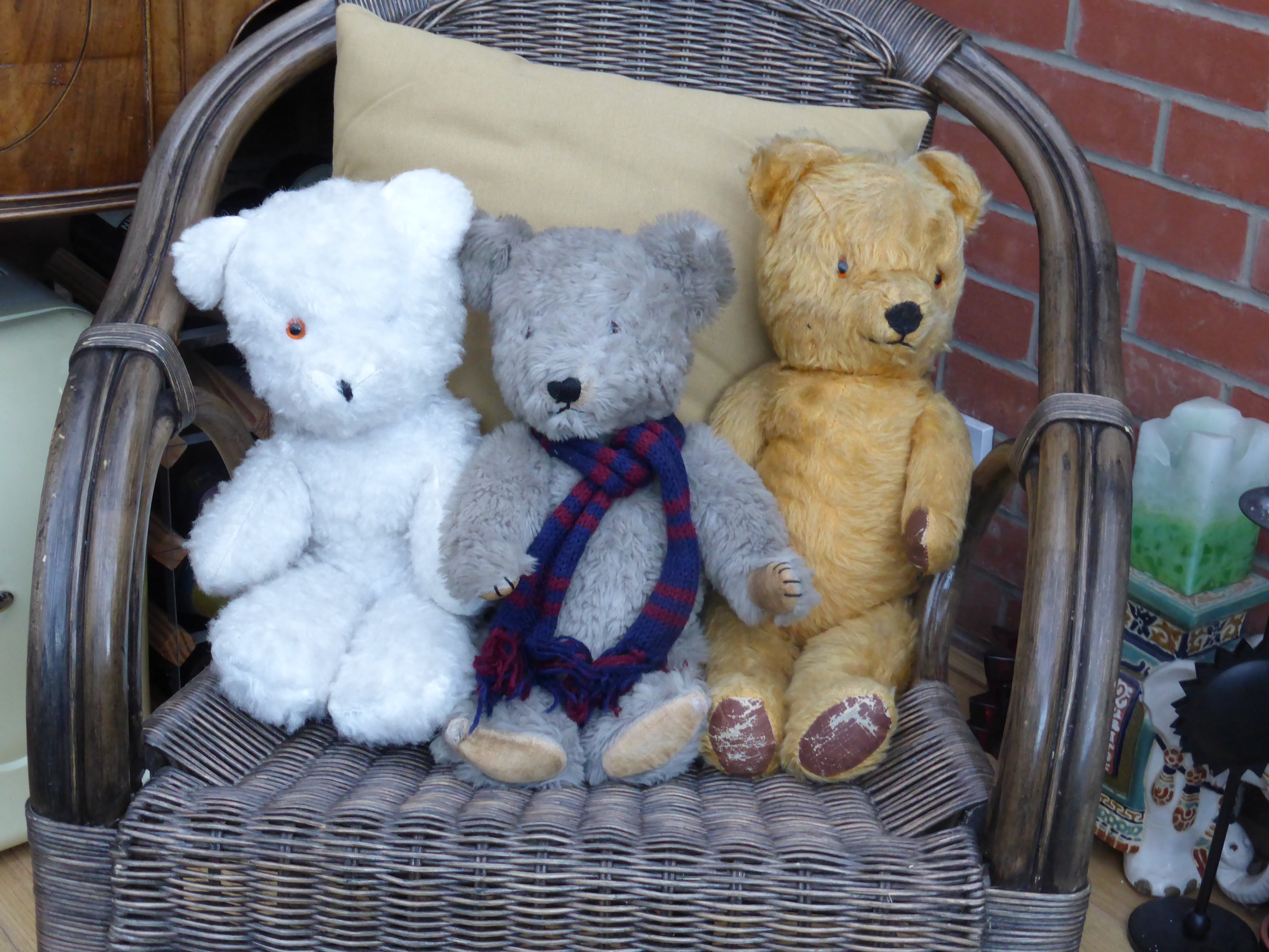 Sarah’s ‘one-eyed’ white teddy (as old as her); my blue teddy (as old as me, complete with Brighton College school scarf); Sarah’s brown musical teddy (from Hong Kong)