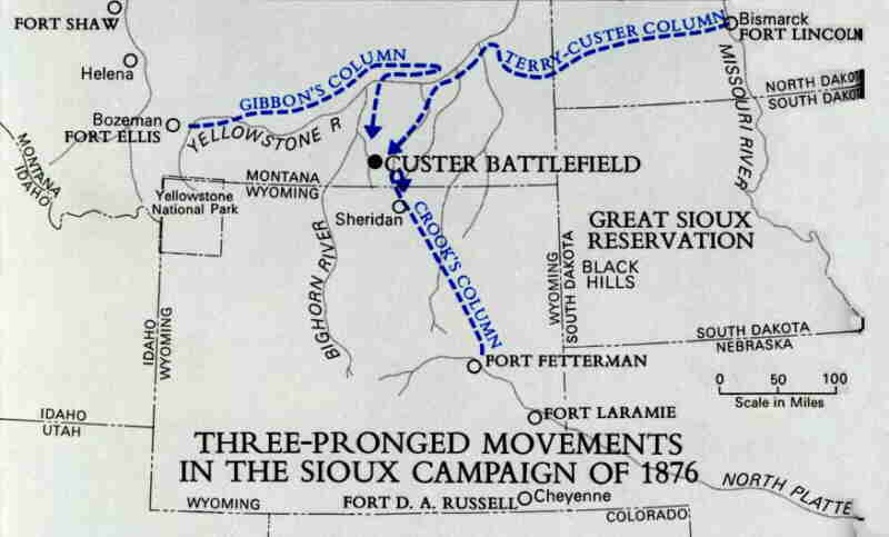 By January 1876 the Lakota Indians under Sitting Bull had not moved to the reservation and General Terry had orders to force him and his followers to do so or destroy them in the process. The plan was a three pronged assault on the Indian village of Sitting Bull’s alliance of Lakota Sioux and Cheyenne around Yellowstone River and four of its close tributaries, the Bighorn, Rosebud, Tongue and Powder (see map below). Terry (and Custer), with 1200 men, would approach from the east from Fort Lincoln; Colonel Gibbon, with 440 men, from the west from Montana; and General Crook, with 1100 men, from the south from Wyoming. Terry and Custer left via separate routes to clear up any Indian stragglers. Apparently Terry had said to Custer that if he (Custer) got there before him to leave him some action. Custer allegedly replied, simply, “No” (but I have no source for that…). Custer was a ‘dog off the leash’.