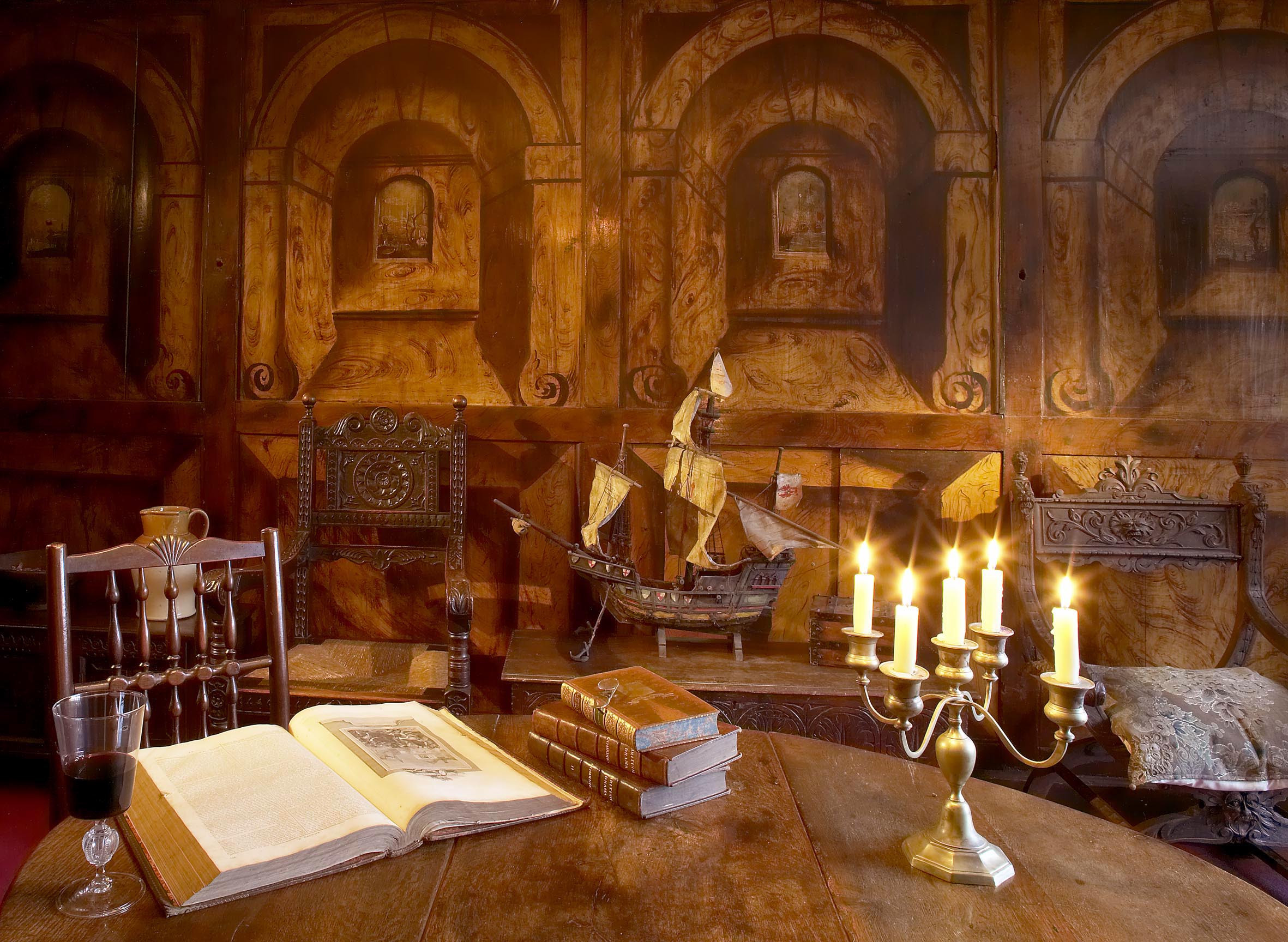 The Warden’s room (or Monks’ parlour) contains some of the earliest oak panelling in the house, dating from the 16th century. There is also a unique massive ‘dragon’ beam carrying the weight of the upper floor. The Elizabethan inglenook would have been used for cooking when the great kitchen in the west wing was lost.