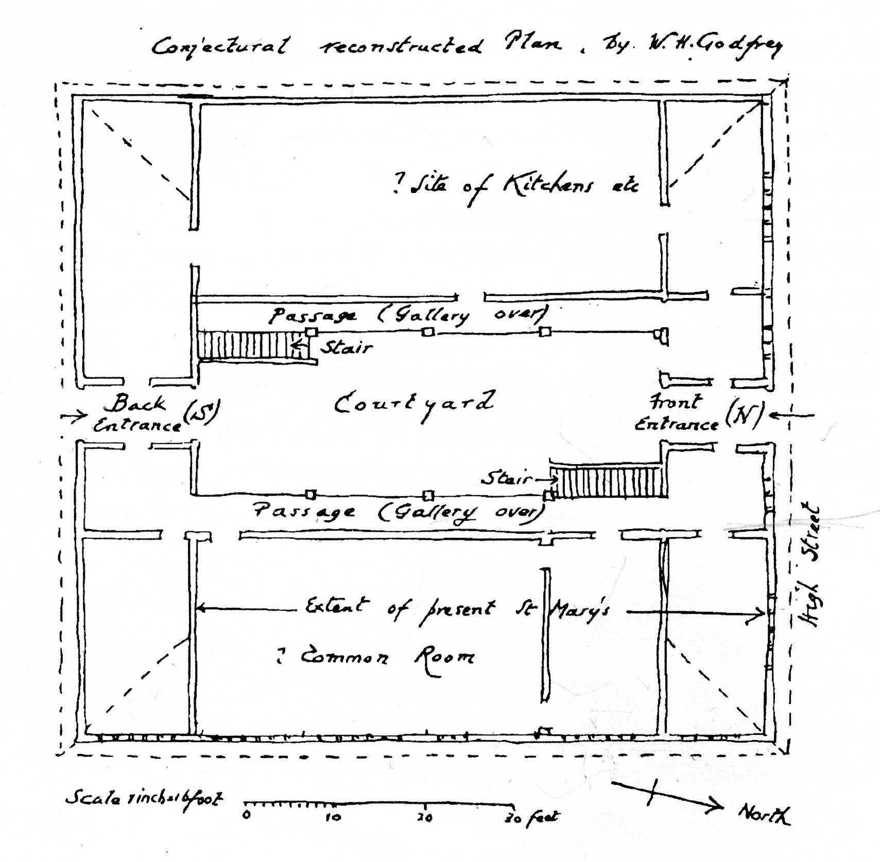 Plan of what the house may have been like as a four-sided building in 1470 (street to right) – by Walter Godfrey (Thorogood, St Mary’s Bramber, 1998, 8)