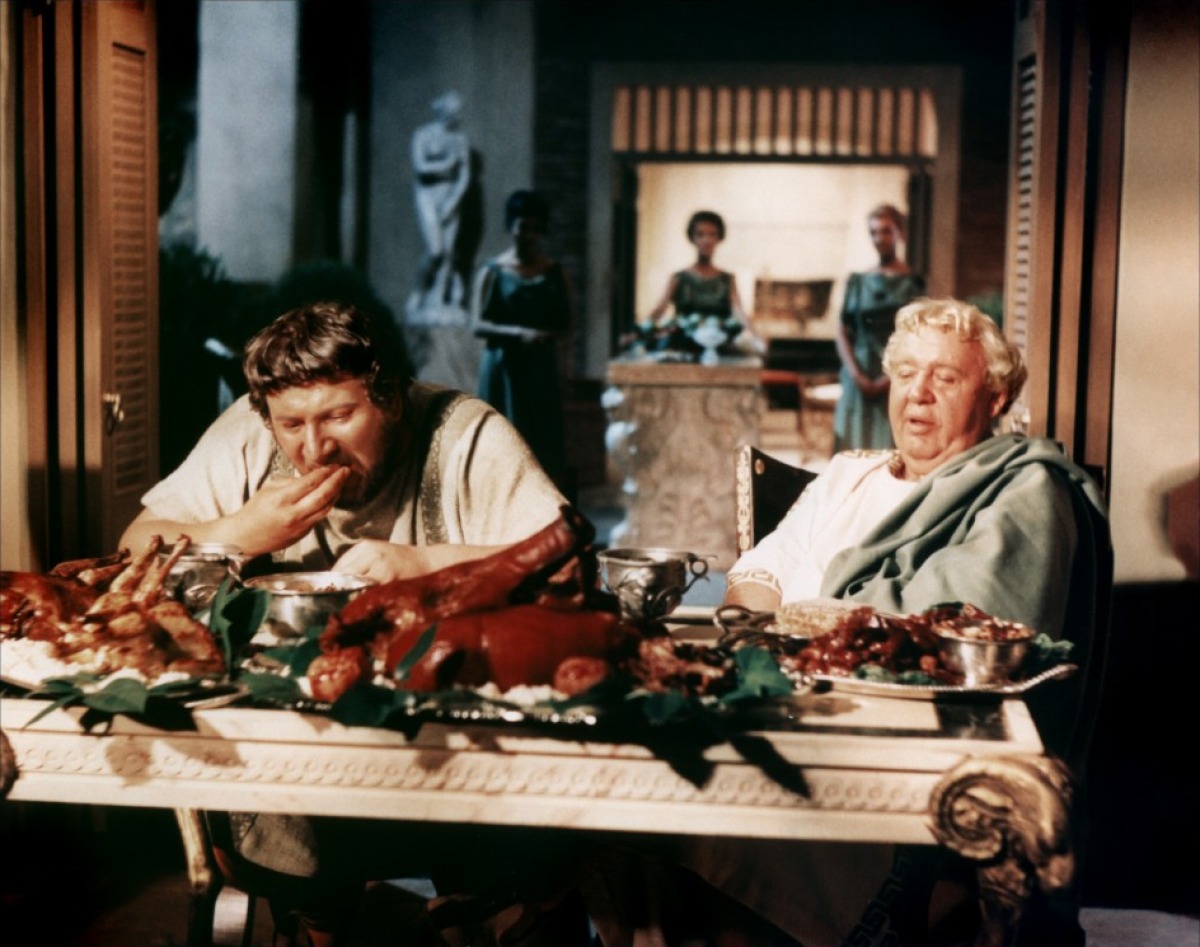 Peter Ustinov (Batiatus) and Charles Laughton (fictional Gracchus) – what a great pairing!